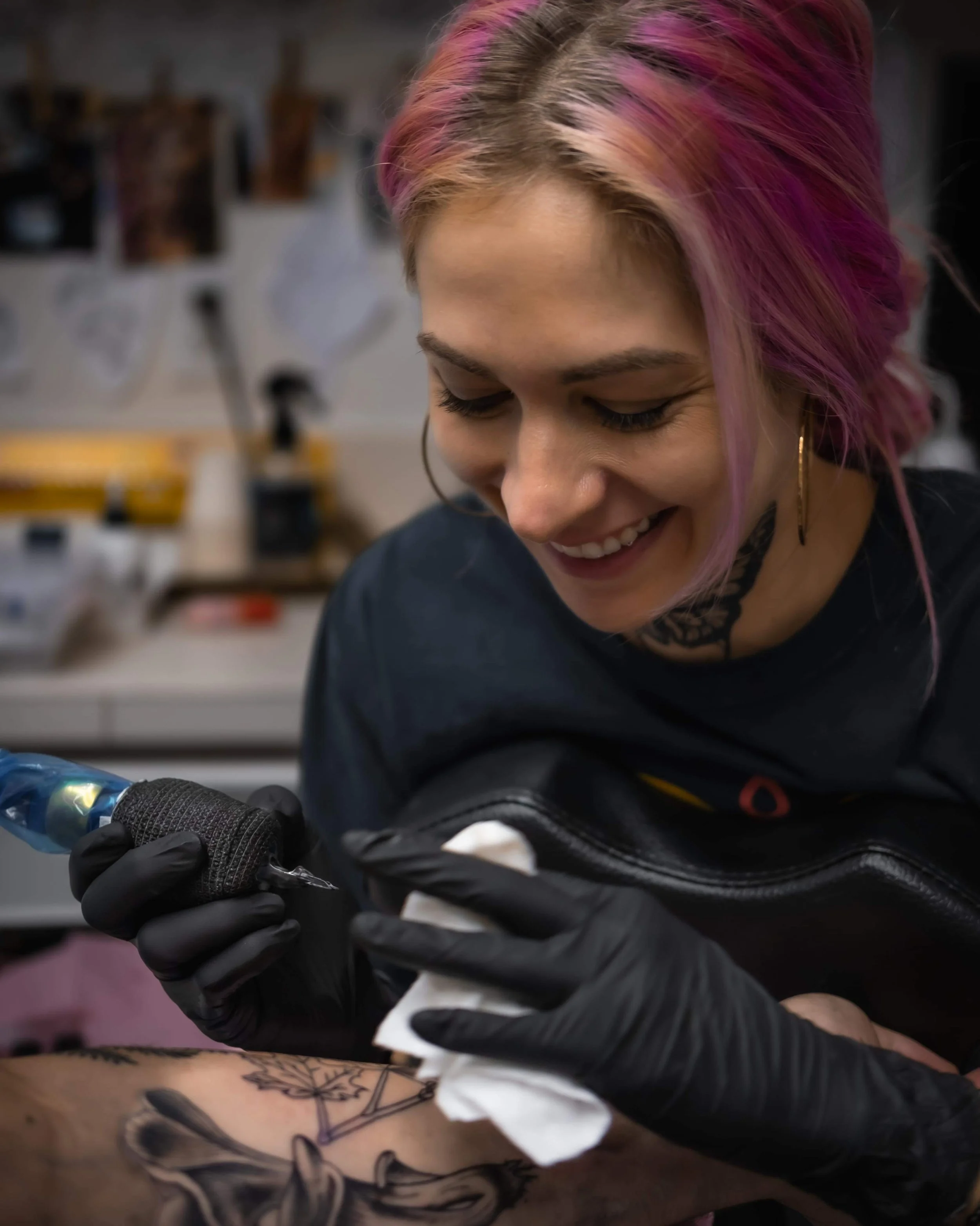 Goldie has been tattooing for over 4 years, starting her journey under the talented artists of The Good Life Tattoo Parlor in El Paso, TX. Her work is inspired by all things nature: animals (living, fantasy, and extinct), flowers, foliage, skulls, and feminine subjects. She also brings anime, cartoons, and vibrant illustrative styles to life through her tattoos. Goldie specializes in fineline, illustrative, semi-realism, and neotraditional, with a touch of color realism when the subject calls for it. You can also book and chat with her about your ideas through her business email: kunu.tattoos@gmail.com